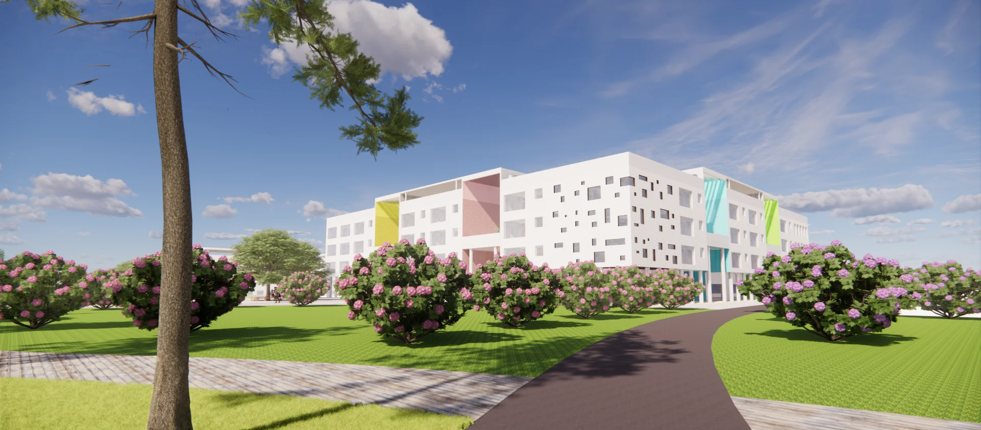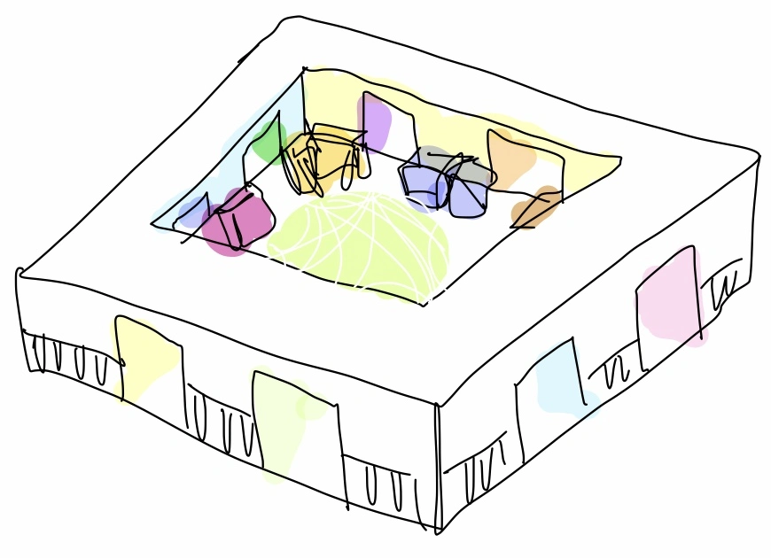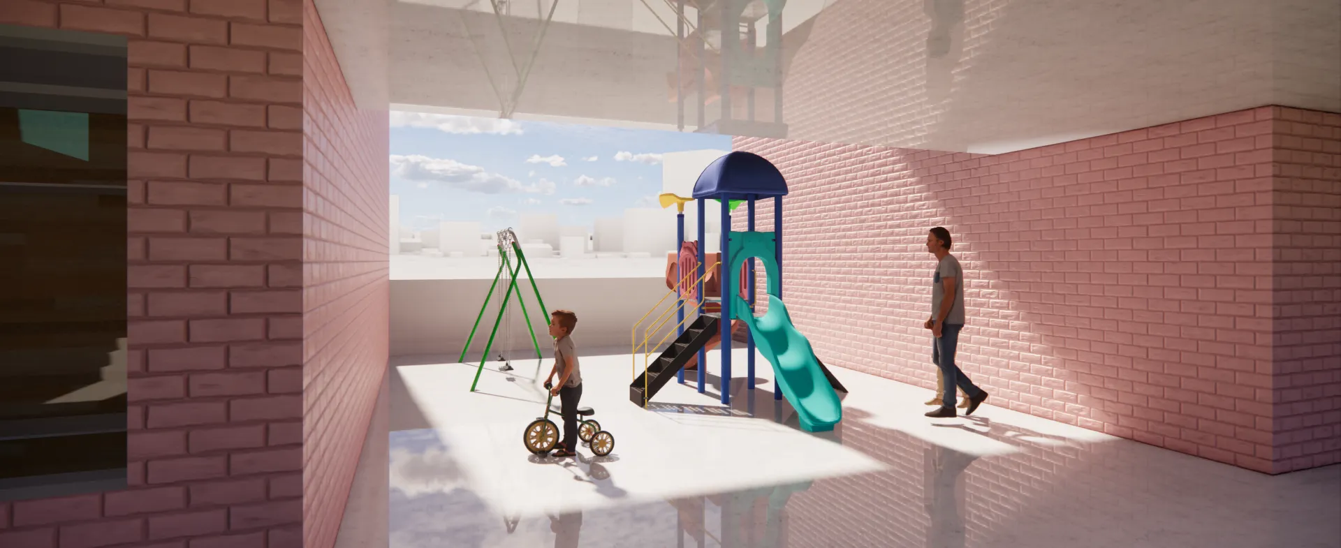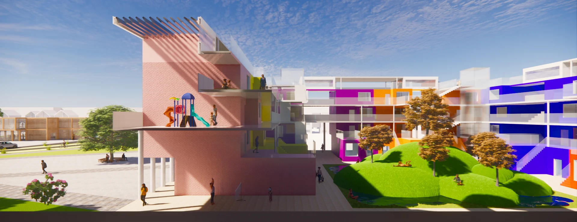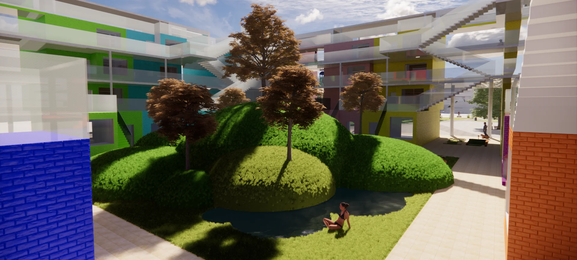 The project is a housing scheme designed to last for generations. The goal is to foster a resilient, connected community within a self-sustaining ‘island’, or insula. The design concept was to create pockets of communal spaces, visually expressed with colour, between each housing unit.