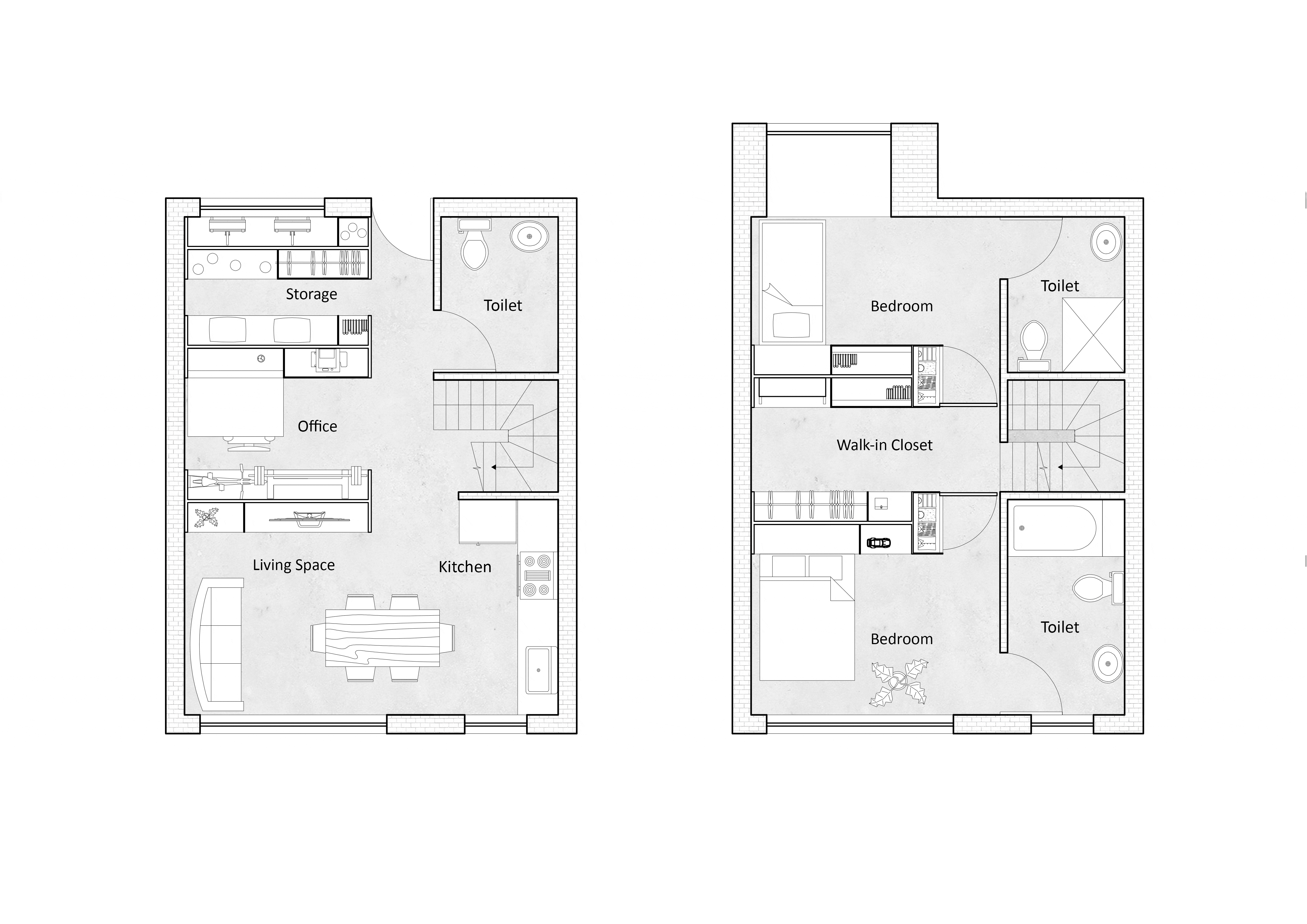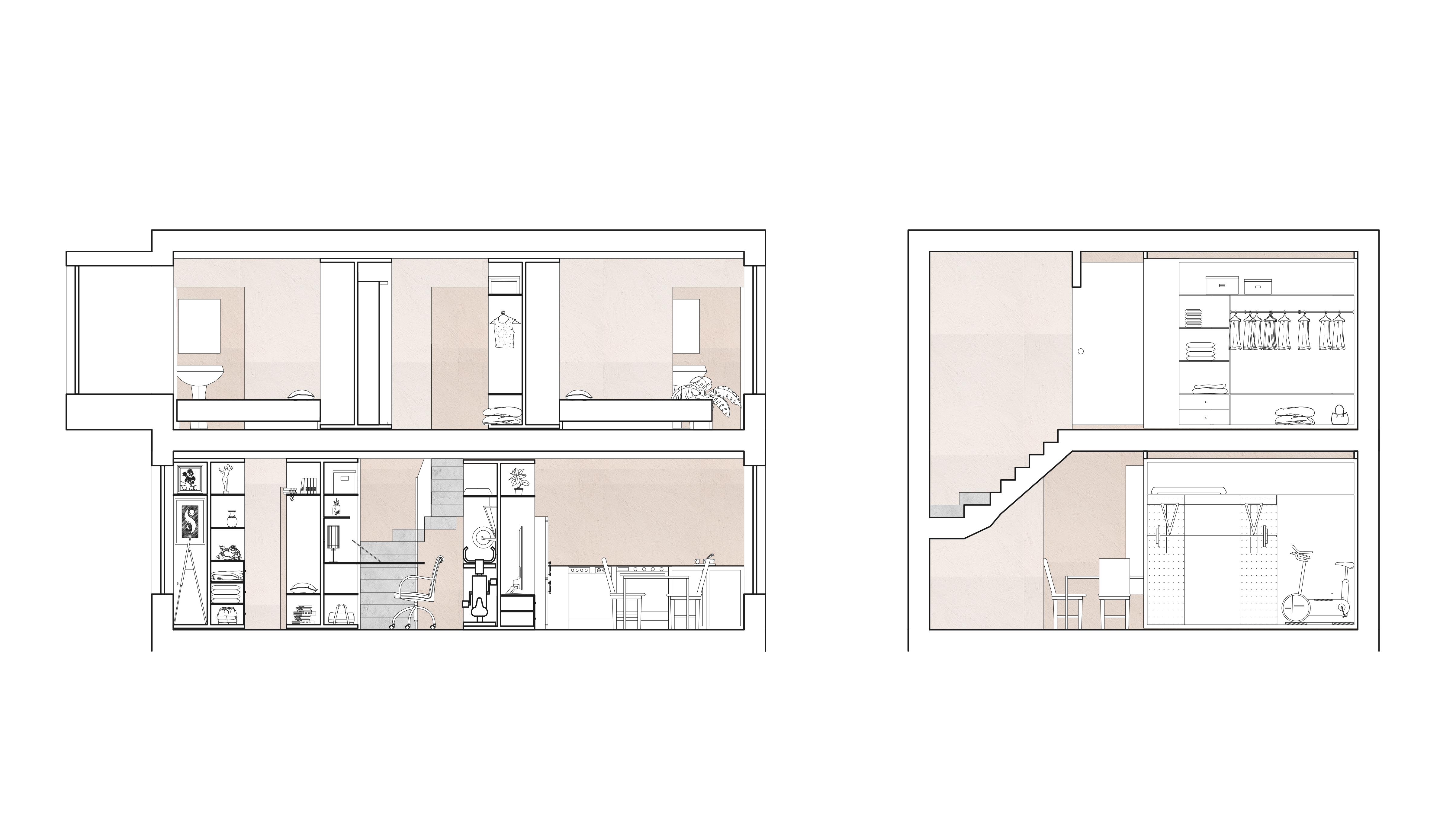 Each apartment has an open floor plan with built-in furniture modules that can be moved to adapt the layout of the space in accordance to the user’s needs.